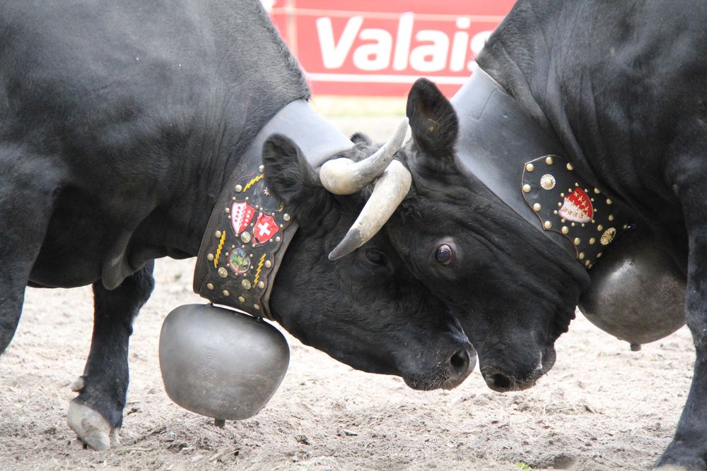 瑞士南部瓦莱州举办的斗牛大赛,是由母牛进行分级别捉对厮杀,竞逐“女王”宝座