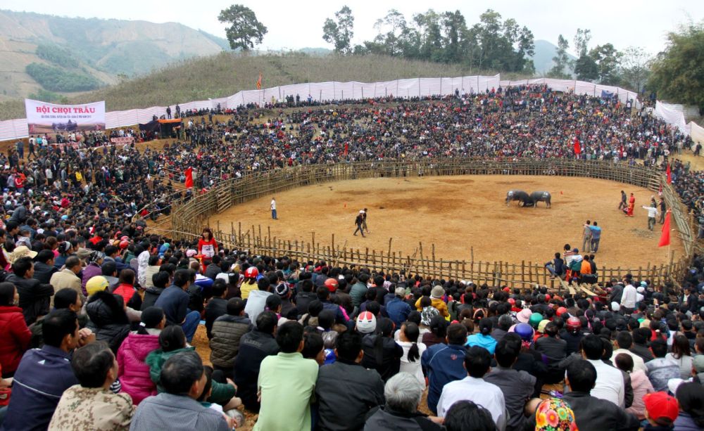 人们在越南北部安沛省观看斗牛赛现场