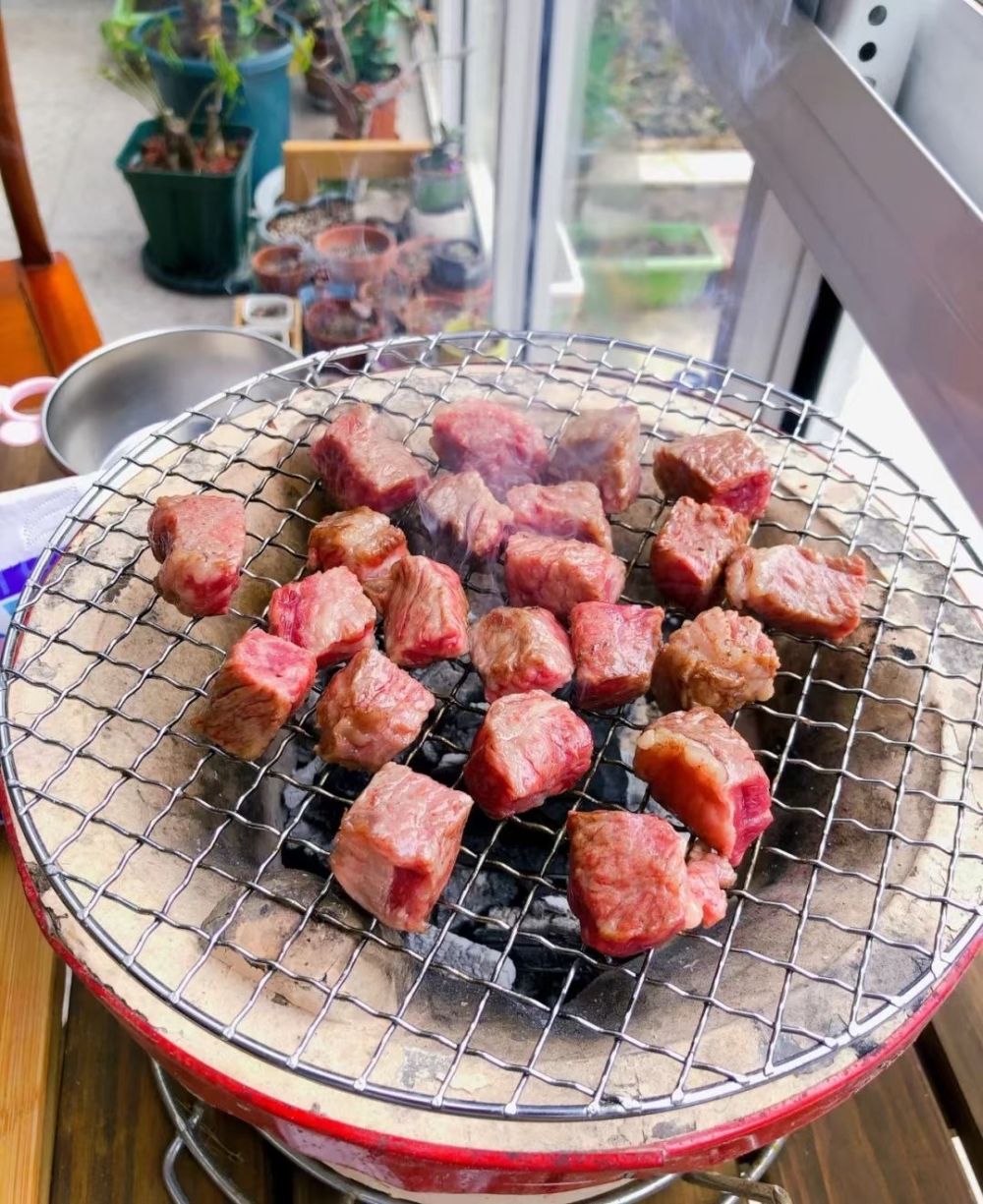 四川成都的居民在家中用炭火盆烤牛肉