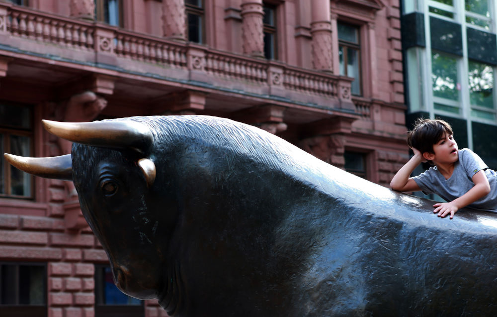一名儿童在德国法兰克福证券交易所的铜牛雕塑上玩耍