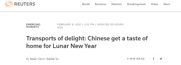文章称,从本周五开始的中国农历新年通常是世界上最大规模的年度迁徙,数以亿计的农民工会返回家乡,但今年为了减少疫情传播风险,许多民众遵守疫情防控要求,选择就地过年。
