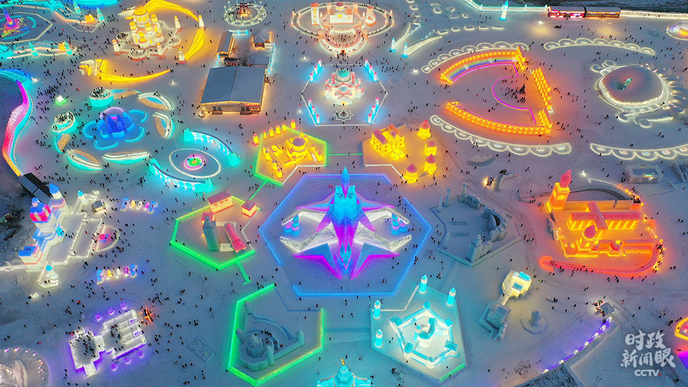△哈尔滨冰雪大世界打造了中东欧17国主题城堡园区,夜景璀璨,如梦似幻。