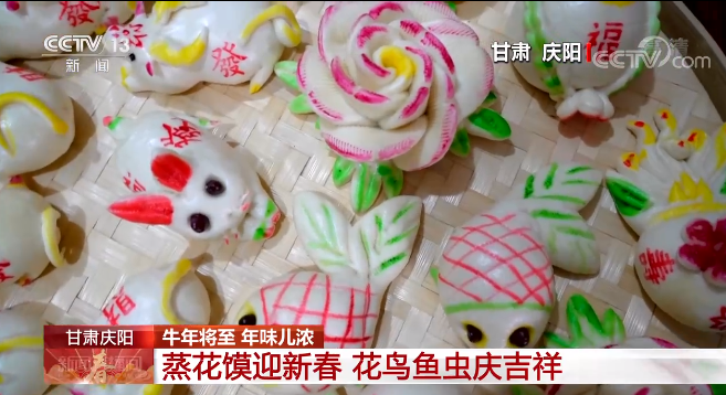 北方多地都有着过年蒸花馍的习俗。在甘肃庆阳,花馍也叫做年馍,图案多以花鸟鱼虫为主,捏成寿桃等形状,寄托着人们对美好生活的向往。