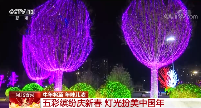 在河北廊坊市香河县,城区亮化景观和节日彩灯全部点亮。新城公园、五一公园等重要节点的亮化光源装饰一新,街道两侧的行道树上缠绕着五彩缤纷的线灯,营造出错落有序、层次鲜明的亮丽夜景。街道两侧一串串火红的灯笼,烘托出浓浓的年味。