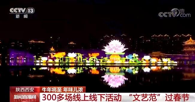 今年春节期间,陕西西安市组织了5大系列300余项线上线下活动,给居民们送上丰富的文化大餐。在大唐芙蓉园,水陆花灯绚丽多彩,“荷塘月色”“悦动花海”“爱之恋”等灯组展现出满园春色,传递着幸福喜悦。