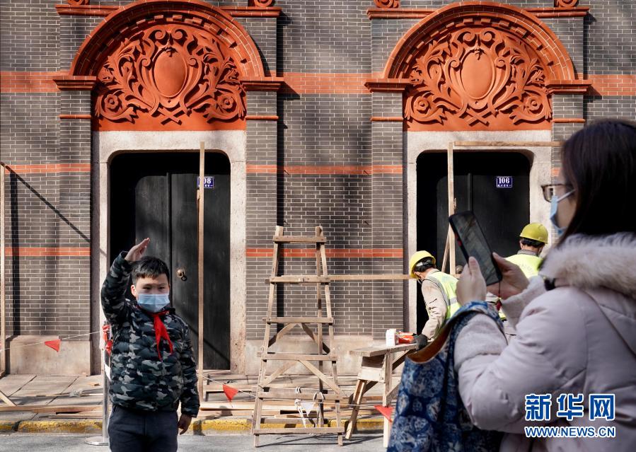 2月4日,上海市民林女士在修缮中的中共一大会址前为小学三年级的儿子拍照。新华社记者 刘颖 摄