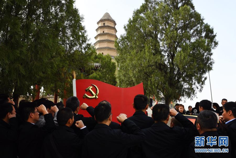 游客在陕西延安宝塔山上重温入党誓词(2019年4月25日摄)。新华社记者 刘潇 摄