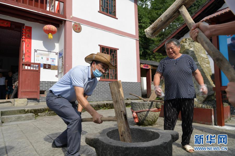 游客在江西省井冈山市神山村村民左秀发家体验手打糍粑(2020年7月15日摄)。新华社记者 彭昭之 摄