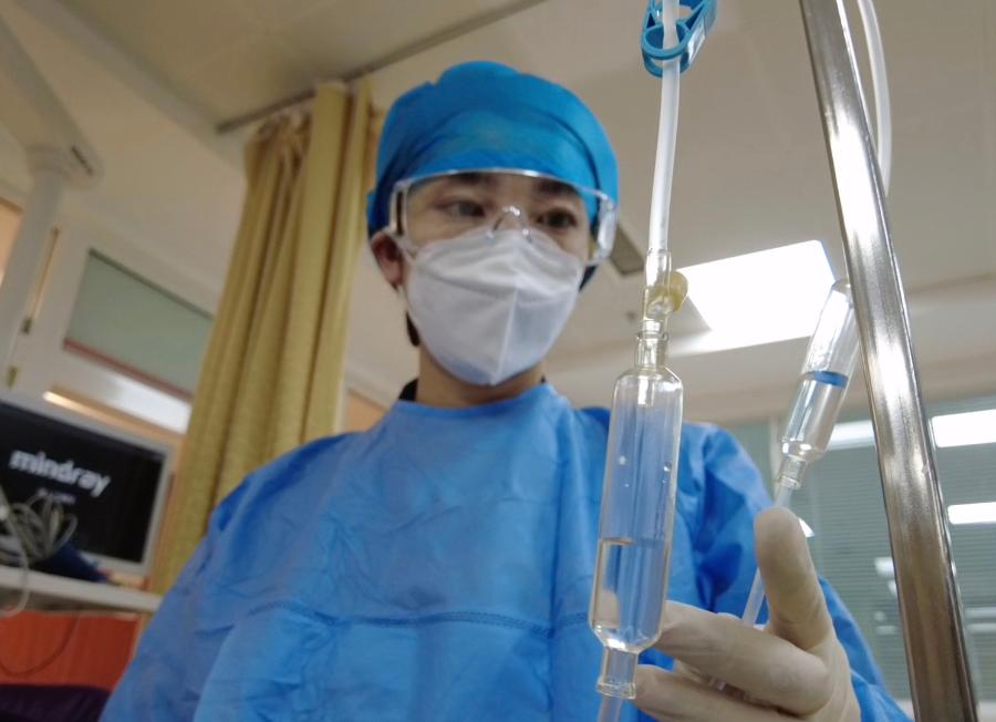↑2月11日,沈阳医学院附属中心医院急诊科护士边春雨为患者检查输液情况。新华社记者 张逸飞摄