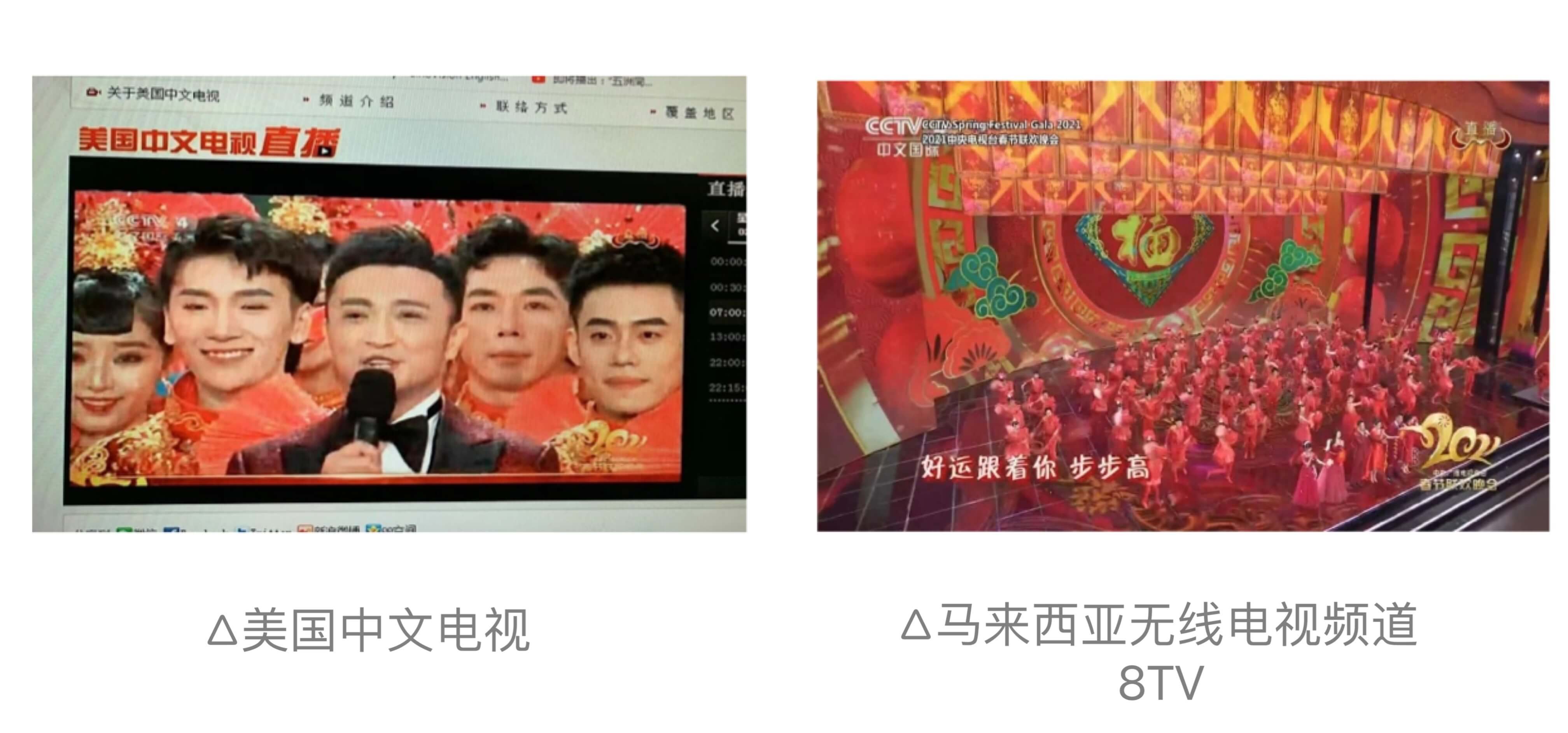 春晚新闻素材被CNN、美国之音、西班牙国家电视台、俄罗斯中心电视台、日本广播公司、巴西旗手传媒集团、意大利广播电视公司、西班牙国家电视台、俄罗斯第一频道、日本NHK、南非广播公司等多家境外电视台/频道采用。