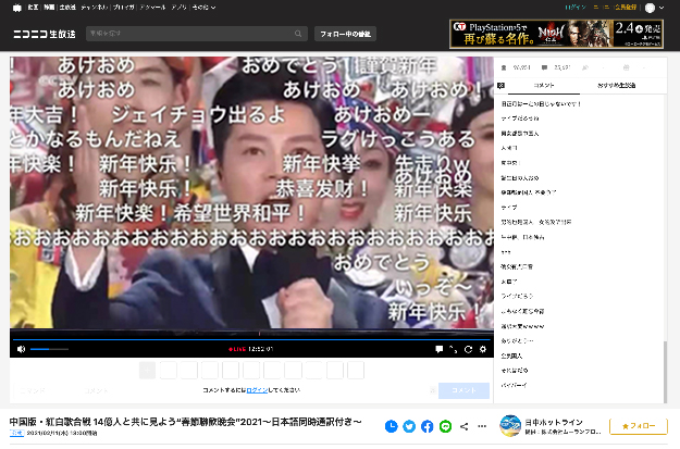 日本最大的视频网站Niconico用日语同声传译的方式,连续第六年对总台春晚进行全程直播,引发日本民众的广泛关注和热烈反响,实时在线观看人数9.74万人,弹幕评论数超过2.6万条,节目好评率达91.7%。日本网友发弹幕评论称“新年快乐”“中日友好”“舞台设计很棒”“中国的技术现在已经远远超过日本”等。