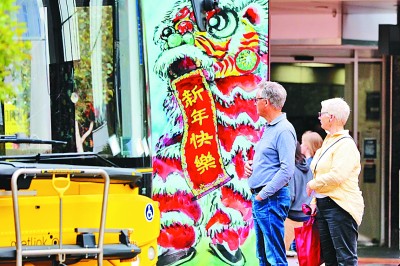 2月6日,在新西兰惠灵顿市中心的商业街上,行人从中国艺术灯箱展中的一处装置旁走过。 新华社发