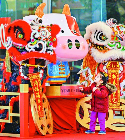 2月11日,一名儿童在加拿大里士满观察一处牛年装饰物。 新华社发