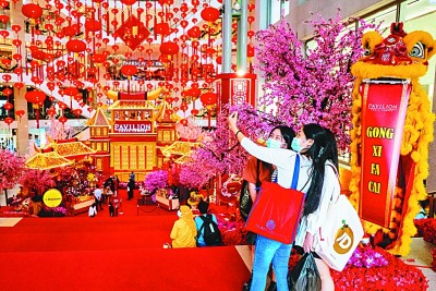 在马来西亚吉隆坡一家商场,人们戴着口罩在春节装饰品旁拍照。 新华社发