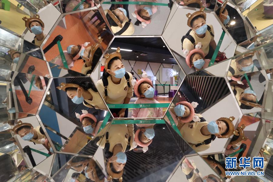 2月16日,小朋友和家长在厦门科技馆体验钝角六面体镜。新华社发(曾德猛 摄)