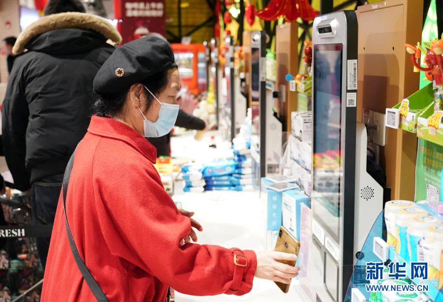 2月15日,在北京市海淀区的七鲜超市北京华宇店,顾客通过自助收银机结帐。新华社记者 任超 摄