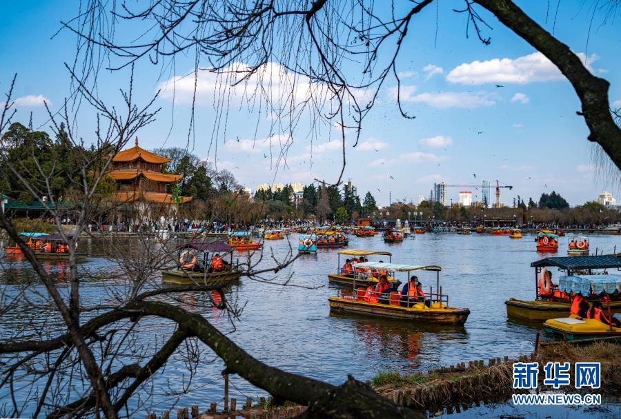 2月16日,游客在云南省昆明市大观公园里划船。新华社记者 陈欣波 摄