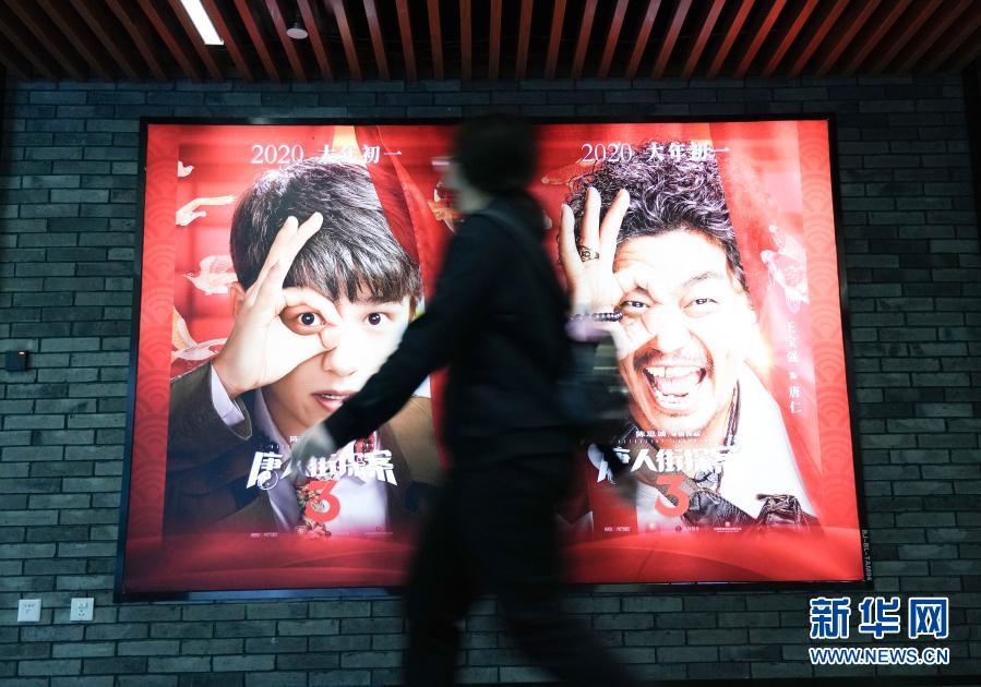 2月17日,在北京前门的保利国际影城,观众从《唐人街探案3》海报前走过。新华社记者 陈钟昊 摄