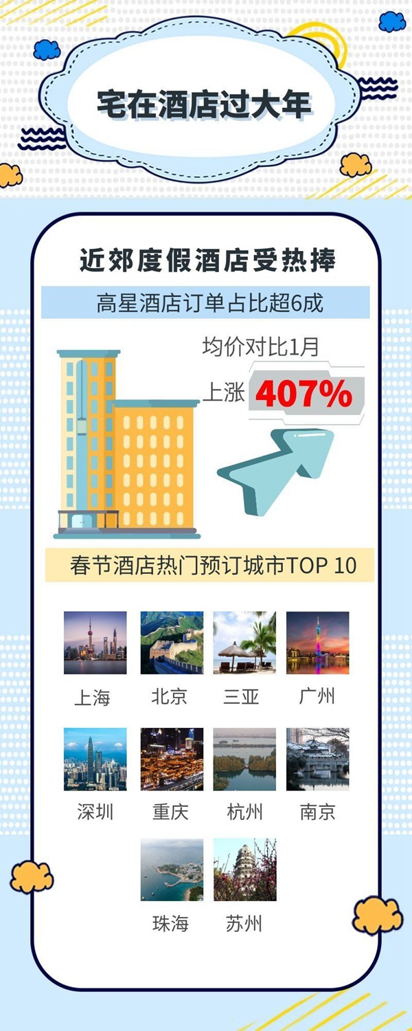 短途游带动了城市郊区度假酒店、民宿等预订火爆。商务部发布的数据显示,春节期间北京延庆、密云等郊区住宿消费同比增长3倍以上,上海崇明、青浦等郊区住宿消费增长2倍以上。