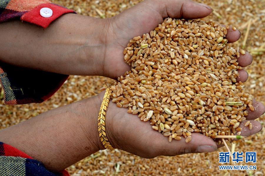 山东省滕州市东沙河镇小宫山村村民在展示新收的“济麦22”麦粒(2015年6月4日摄)。新华社记者 冯杰 摄