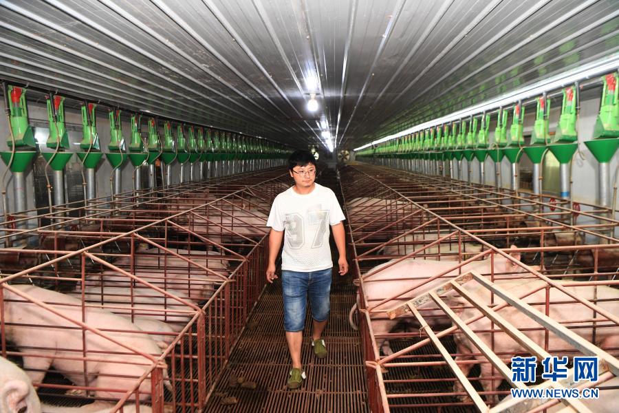 在重庆市万州区高梁镇天鹅村生猪生态养殖基地,工作人员在查看生猪生长情况(2020年6月5日摄)。新华社记者 王全超 摄