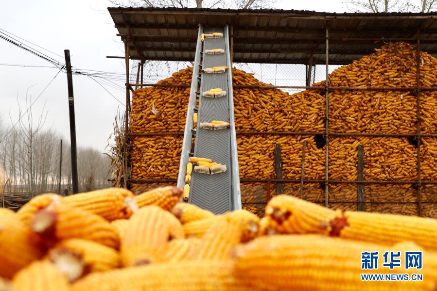 在哈尔滨市巴彦港镇五星村农民程显义家院内,玉米通过传送带进入玉米架子(2020年11月3日摄)。新华社记者 徐凯鑫 摄