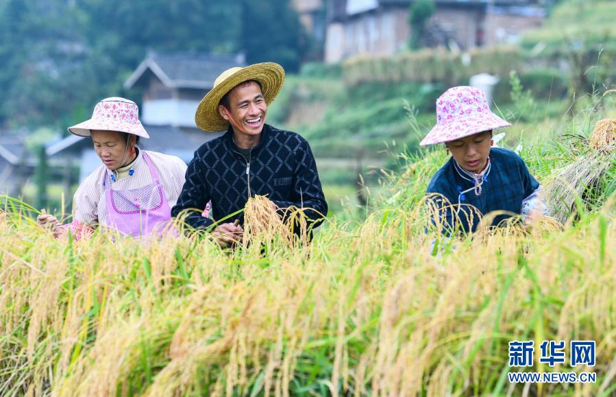贵州省从江县加榜乡加车村的农民在收割水稻(2020年9月19日摄)。新华社记者 杨文斌 摄