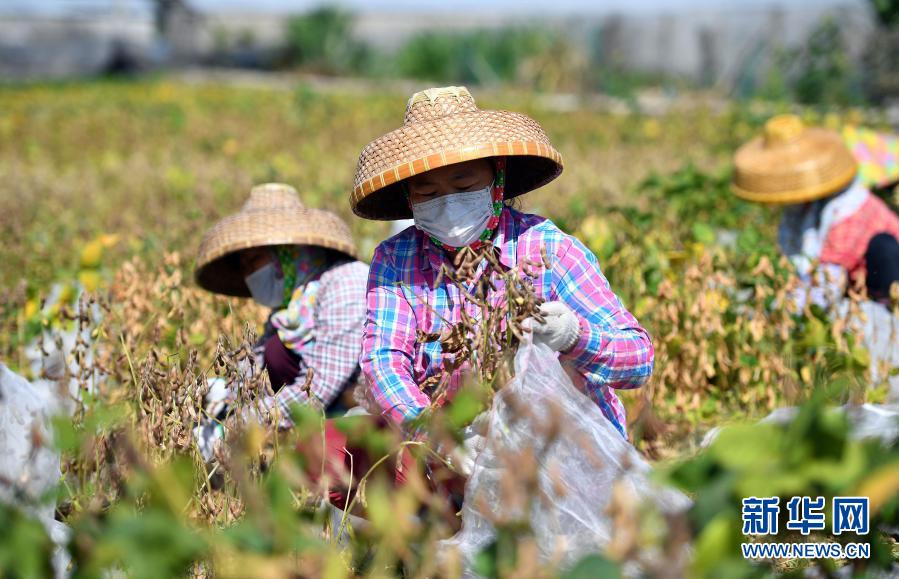工人在采收中国农业科学院油料作物研究所在三亚繁育的大豆(2020年2月27日)。新华社记者 郭程 摄