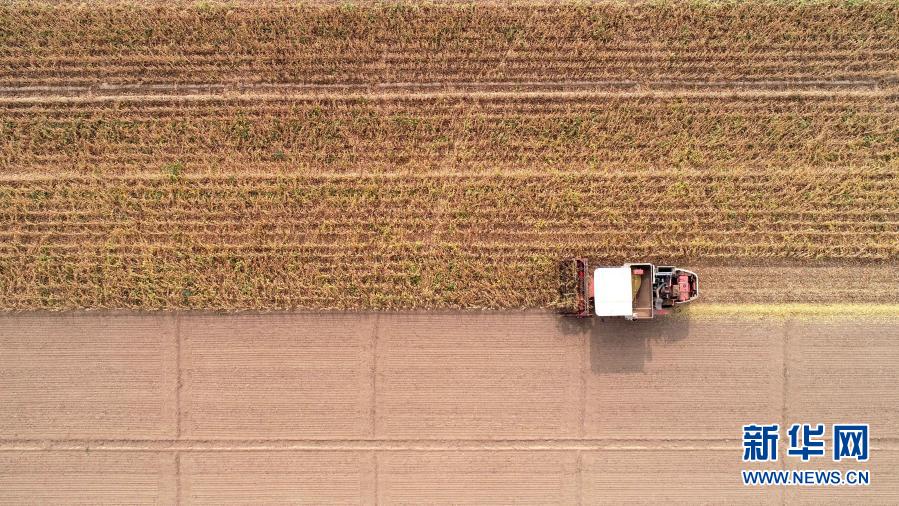 在河北省石家庄市藁城区梅花镇朱家庄村的大豆田地里,农户驾驶农机收割大豆(2020年10月10日摄,无人机照片)。新华社发(梁子栋 摄)