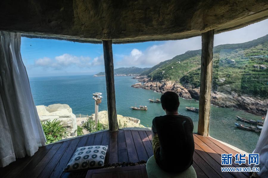 游客在浙江省温州市平阳县南麂岛一家悬崖民宿酒店的海景房内观赏海景(2019年7月17日摄)。在“绿水青山就是金山银山”理念指引下,浙江省大批乡村发生美丽蜕变,吸引工商资本回到乡村,各种民宿蓬勃发展。新华社记者 徐昱 摄