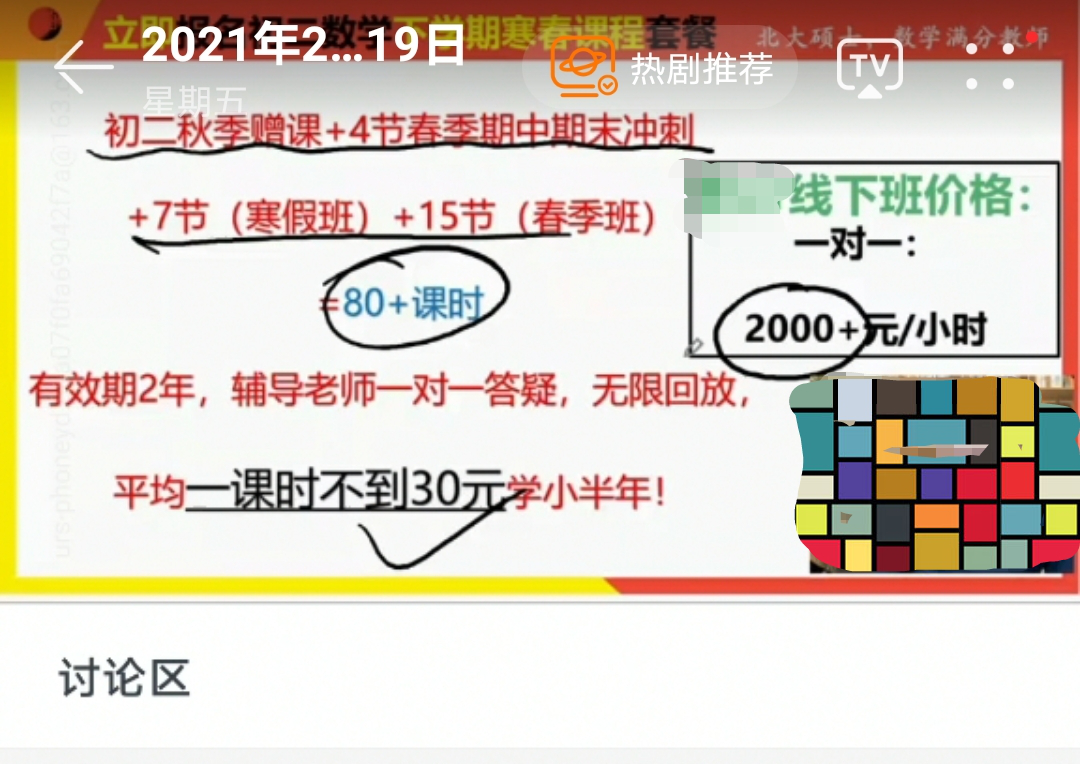 未来网北京2月25日电(记者 李盈盈)“现在报名我的在线课,(一学期)只需要2000多元,特别划算!在线下,报我的一对一课,一节课收费2000多元,而且,(学生排队)已经排到了半年之后。”春节过后,家长权翼为孩子领取了在线教育机构网易有道精品课的免费课。课程快结束时,该机构的一位数学“名师”变身销售,大力卖课。