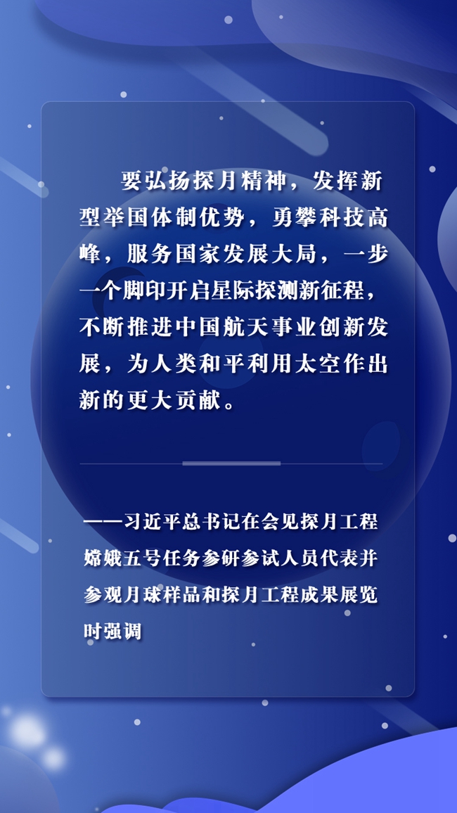 近日,在会见探月工程嫦娥五号任务参研参试人员代表并参观月球样品和探月工程成果展览时,习近平总书记充分肯定探月工程特别是嫦娥五号任务取得的成就,对航天工作者弘扬探月精神,开启星际探测新征程寄予殷殷期望。
