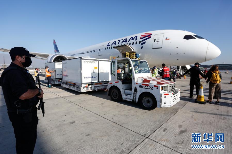 2月26日,在智利圣地亚哥国际机场,工作人员转运中国科兴公司生产的新冠疫苗。