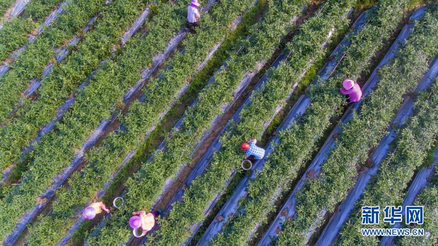 2月28日,在海南省琼海市塔洋镇一处瓜菜种植基地,农民在采摘辣椒,准备销往国内各大批发市场(无人机照片)。