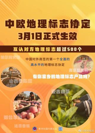 新华社北京3月1日电(记者 于佳欣)中欧地理标志协定今起生效。首批“上榜”的中欧各100个地理标志即日起受到保护,这意味着中国和欧盟的更多特色优质名品将进入彼此市场,不仅将更好保护中欧企业权益,也会让双方消费者买得放心。