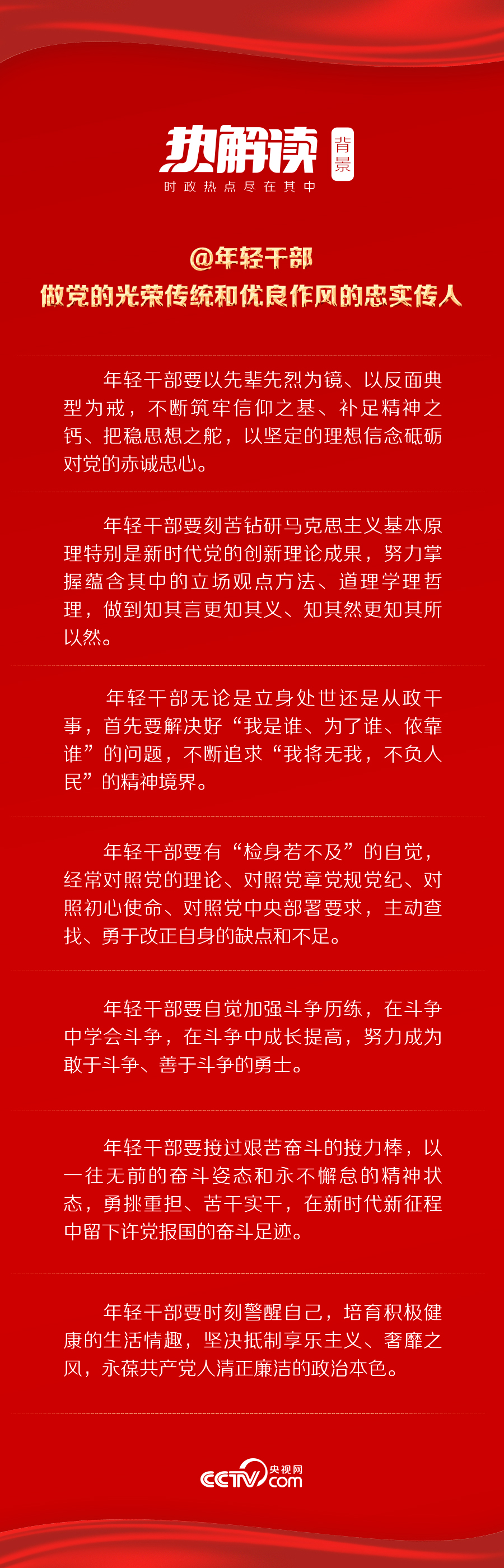 年轻干部是党和国家事业接班人,承担着新时代全面建设社会主义现代化国家的艰巨任务。抗疫一线,有他们以生命赴使命的勇毅;脱贫攻坚主战场,有他们“不获全胜,决不收兵”的决心;中华大地上,有他们只争朝夕的奋斗身影。