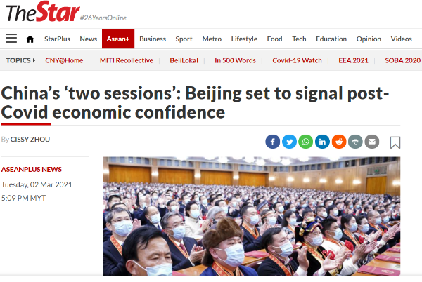 《马来西亚星报》网站3月2日报道称,在本周召开的两会上,中国政府将传递出这样的信息,即中国在经济复苏中取得了前所未有的成功,并将详细说明如何在未来五年实现新的发展目标。