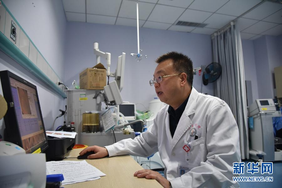 2月20日,全国人大代表、遵义医科大学附属医院消化病医院院长庹必光在诊疗室里查看病人内镜检查情况。新华社记者 骆飞 摄