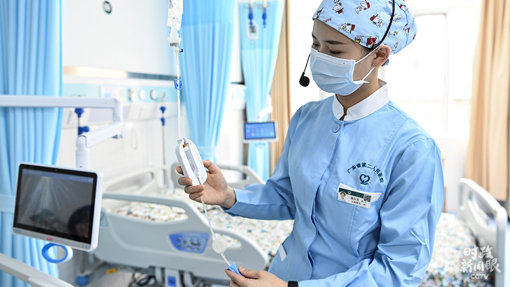 △广东省第二人民医院工作人员在5G智慧病房内演示“智能输液监测器”的功能。