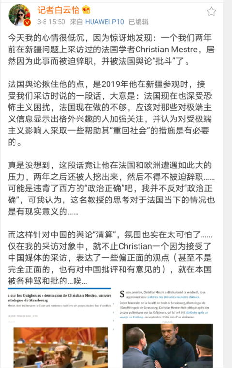 对此,在2019年时就新疆问题采访过他的本报记者白云怡和谢文婷透露,她们认为梅斯特教授被法国反华势力不断骚扰才被迫说出这番话的可能性极大,因为她们在反复核查了当年的报道资料后确定她们不存在曲解他意思的情况,在报道中使用的多数是这位法国学者的原话,两位记者还指出,他对中国新疆去极端化和预防恐怖主义的政策给出的评价,也是客观和有见地的,还对比了法国现实的情况,看得出是经过一番思考的。