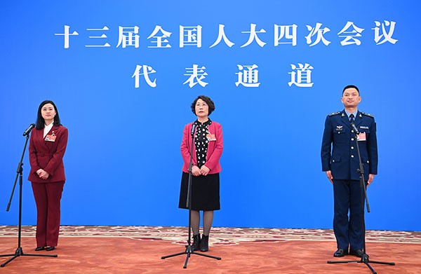 全国人大代表袁晶、郭艳玲、余海龙(从左至右)通过网络视频方式接受采访。新华社记者 金良快 摄