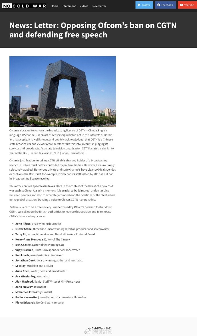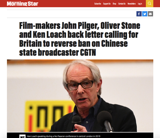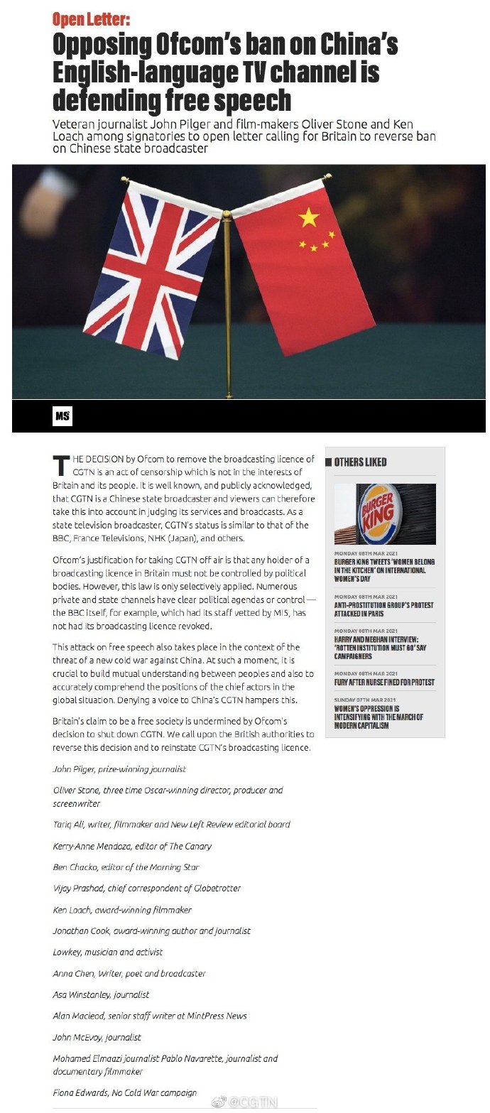 3月9日,多位国际知名人士在英国《晨星报》和“拒绝新冷战”机构官方网站联合发表署名公开信,反对英国通讯管理局对中国国际电视台(CGTN)的禁令。参与此次联名的包括澳大利亚著名战地记者、电影导演约翰·皮尔格(John Pilger),三次获得奥斯卡奖的导演、制片人、编剧奥利佛·斯通(Oliver Stone)以及英国电影学院奖终身成就奖得主肯·洛奇等多位知名人士,包括在英国享有一定声誉的作家、记者编辑、电影人、音乐人等。
