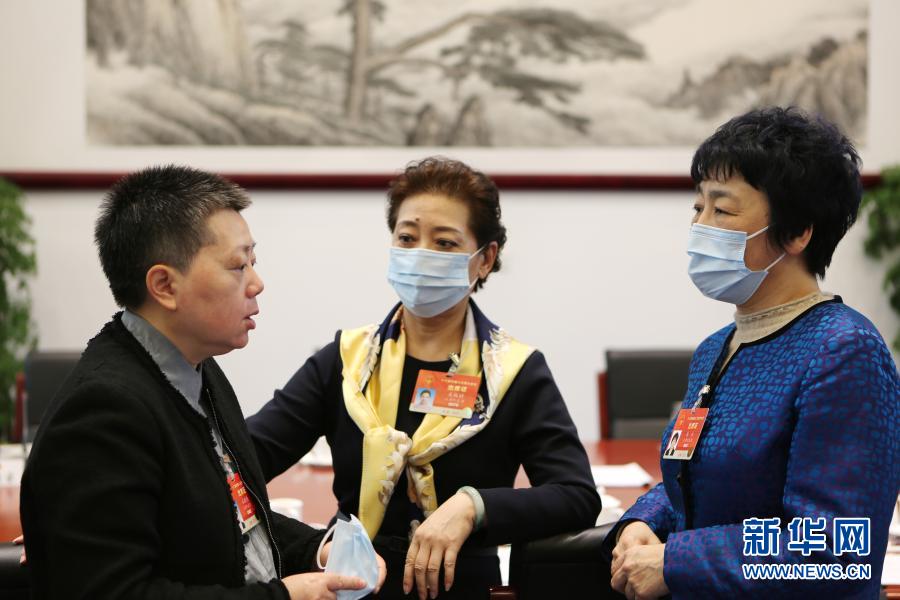 3月6日,十三届全国人大四次会议天津代表团的孔晓艳代表(左)、关牧村代表(中)和马杰代表在会议间隙交流讨论。新华社记者 吴雨 摄