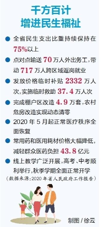看就业保障——全省点对点输送70万人外出务工,带动717万人跨区域返岗就业,援企稳岗660万个次,开发扶贫公益岗位31.4万个;多渠道多方式帮助高校毕业生、退役军人等重点群体就业。