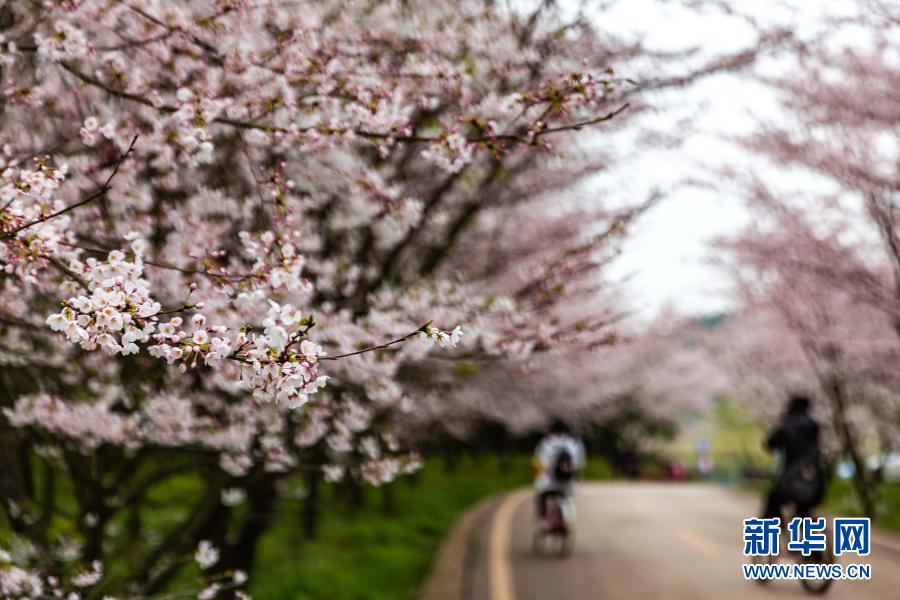 春季里,贵州省贵安新区红枫湖畔的樱花园内樱花绽放,花海如云似雪,吸引游人踏春赏樱。