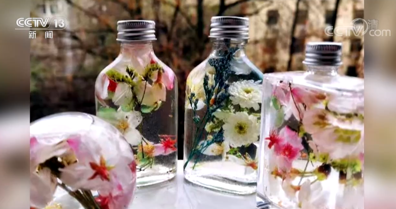 武汉大学研究生 赵冀帆:樱花标本里的樱花花瓣,都是前几天武汉刮风下雨的时候,从樱花树上吹落的一些花瓣,然后我自己去捡这些花瓣和完整的花朵,把它们装到一个瓶子里,再兑上营养液,搭配一些树叶就好了。