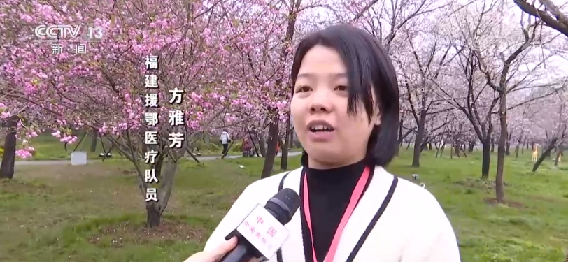 福建援鄂医疗队员 方雅芳:因为去年我们也有来这边樱园赏过樱花,然后回去以后,就说等到疫情过去,等到春暖花开,我们要再回来看看。就感觉武汉真的活过来了,变得非常有活力。