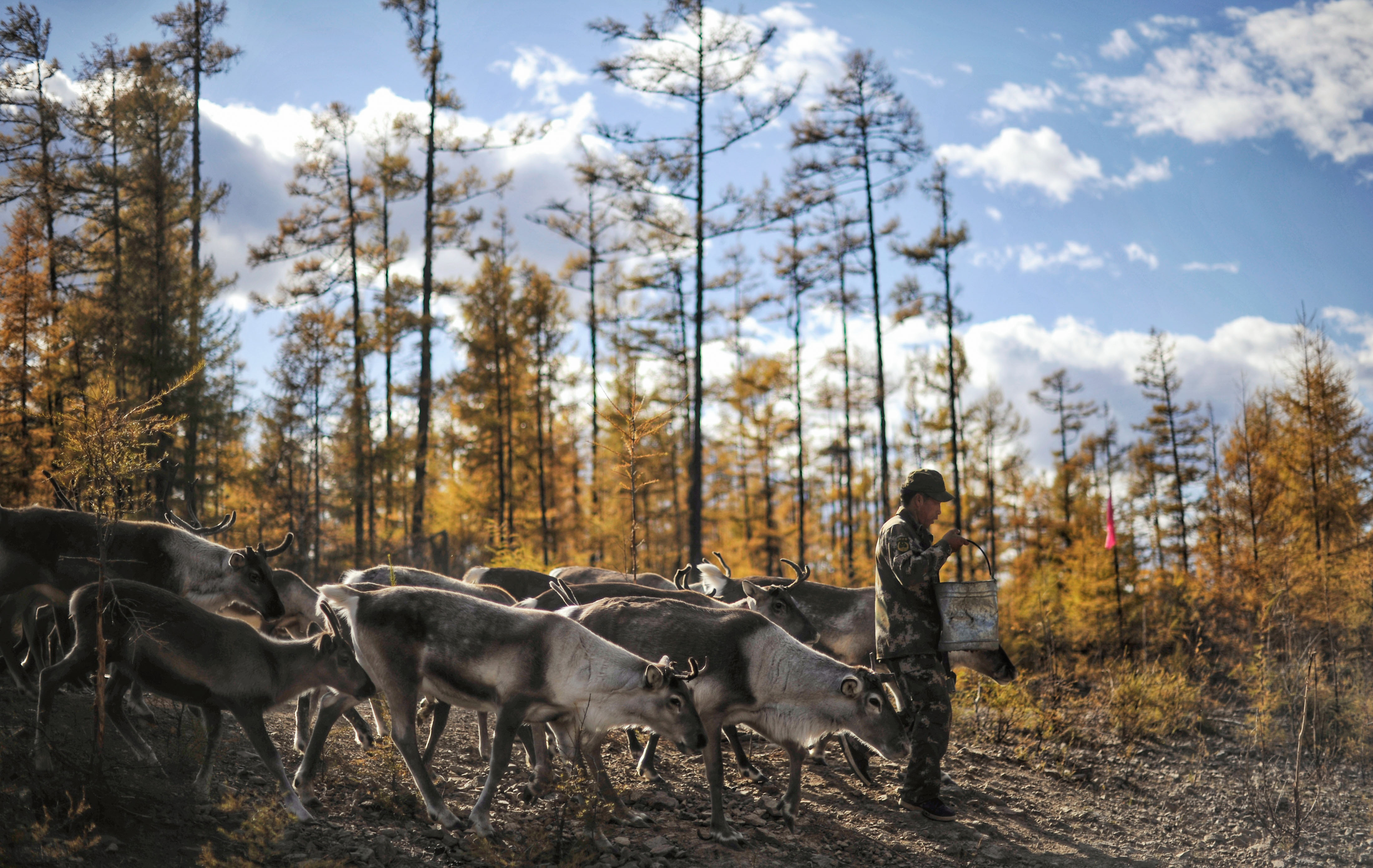 内蒙古大兴安岭根河林业局约安里林场,林场职工张国华为驯鹿补充饲料。