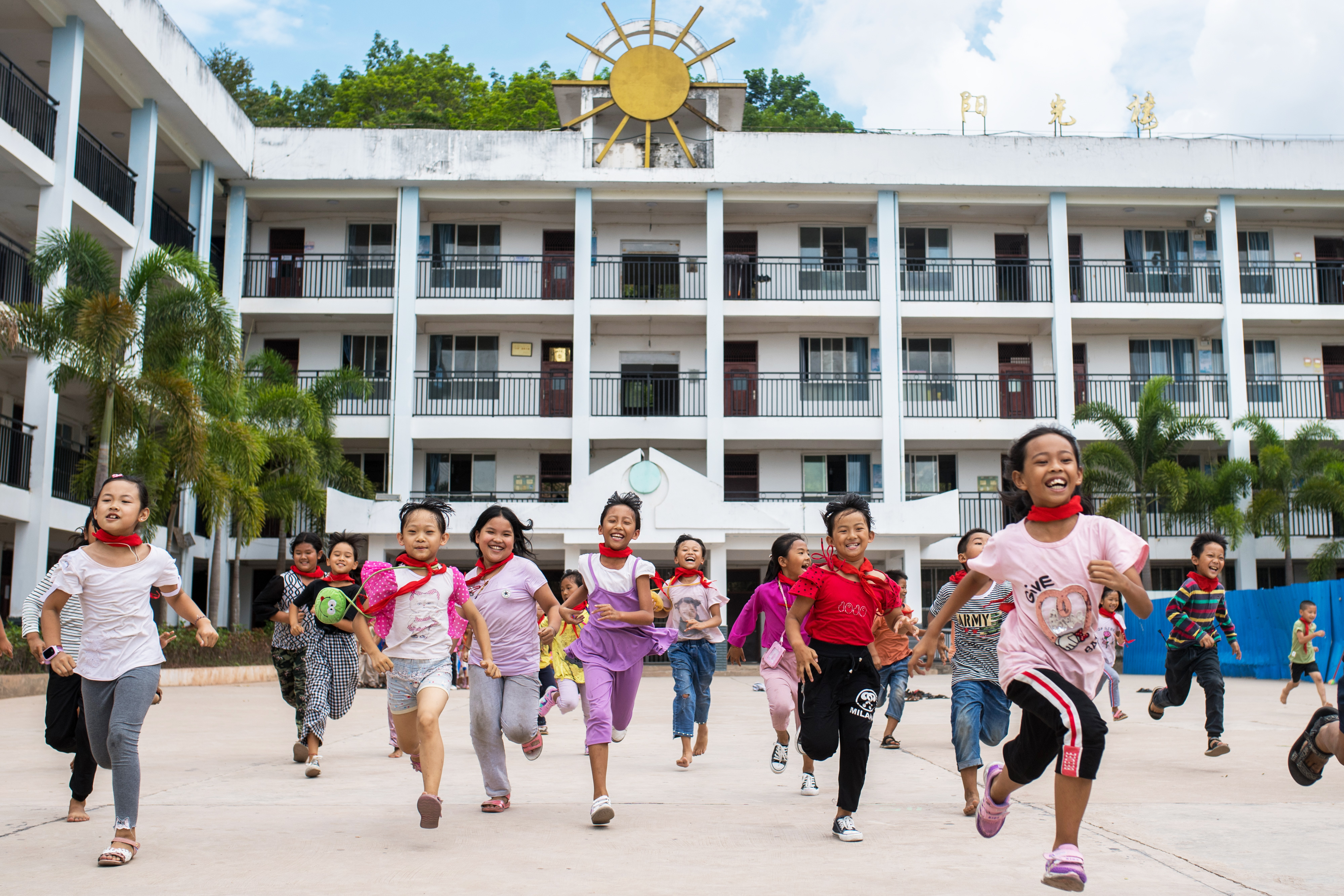 云南西双版纳基诺山基诺族乡民族小学学生在跑步(2019年6月11日摄)。