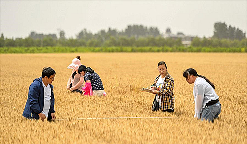 河北省邯郸市临漳县狄邱乡西狄邱村,农业技术人员在麦田内进行小麦测产。新华社记者 王晓摄